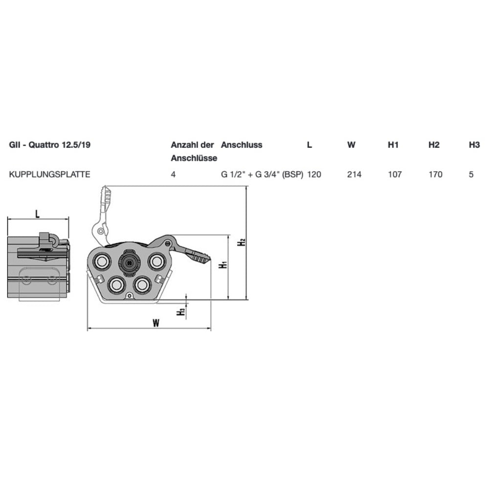 Kupplungsplatte mit 4 Anschlüssen 1/2″+3/4″ BSP (DN12,5+DN19)